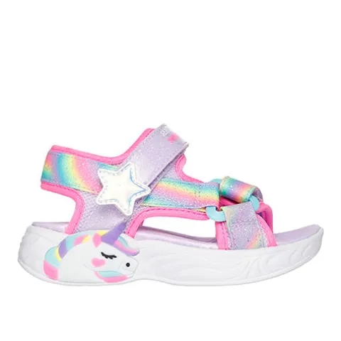 Supersød S-Lights Unicorn Dreams – Dreamy Unicorns sandal med en blinkende enhjørning på ydersiden af mellemsålen. Overdelen er af glitrende vævet tekstil og syntet, og sandalen lukkes med to velcroremme (forfod og vrist), den ene dekoreret med en smuk stjerne. Den polstrede komfortdæksål er blød, støddæmpende og komfortabel, og den fleksible ydersål er stødabsorberende med et fint fodfæste.