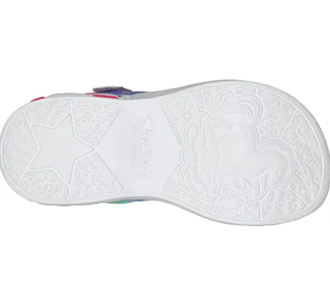 S Lights Unicorn Dreams Majestic Bliss er en festlig og farverig sandal med lys i enhjørningen på ydersiden af sålen ved hælen. Sandalen lukkes med to velcroremme henover forfoden og vristen; remmene har regnbuefarver med sølvstjerner, og remmen over vristen har en flot changerende stjerne for enden. En blød og behagelig sandal.