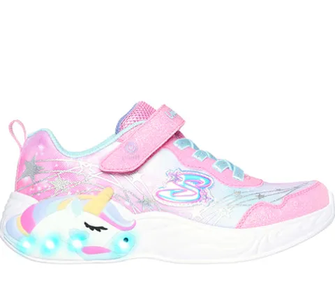 Sød og frisk S Lights Unicorn Dreams – Wishful Magic sko fra Skechers magical collection. Overdelen er af tekstil med print og syntet med glitter, og skoen er dekoreret med bl.a. stjerner. Skoen lukkes med en velcrorem over vristen, og ikkejusterbar elastiksnøre sørger for en god tilpasning til foden dagen igennem. En trækfane på hælen gør det nemt at træde i skoen. Der er blink på ydersiden af ydersålen, som er dekoreret med en enhjørning. En tænd-/slukknap sidder for enden på velcroremmen. Indersålen er komfortabel, og ydersålen har et godt mønster, der giver et fint fodfæste.