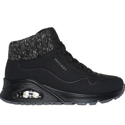 Dejlig Uno Gen1 – Darling Daze støvle med stil og komfort. Denne hi-top sneaker har en overdel af durabuck med en bred kant af strikket tekstil om den polstrede åbning. Støvlen justeres med snørebånd og lukkes med lynlås. Indvendig har støvlen et blødt foer og en Air-Cooled Memory Foam-indersål, så fødderne har det lunt og behageligt. Den stødabsorberende mellemsål med en synlig Skech-Air-boble sikrer høj komfort dagen lang, imens den fleksible ydersål med gummibelægning sikrer et godt vejgreb.