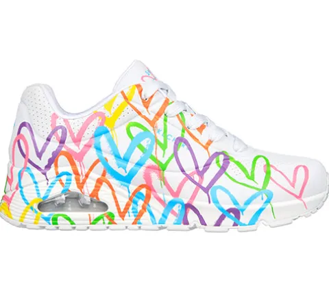 Her får du et par lækre og super flotte JGoldcrown sko, hvor den kendte kunstner James Goldcrown bringer sine ikoniske Lovewall – hjertedesigns til Skechers.