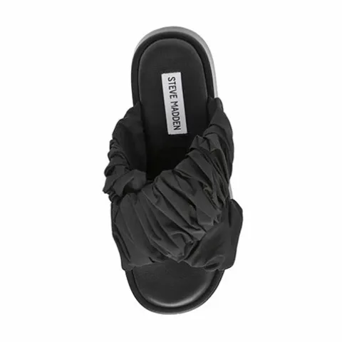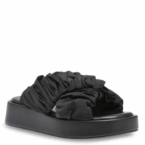 Lækker Bellshore slip-on-sandal med to brede remme beklædt med tekstil med rynket effekt, der krydser hinanden over vristen. Indersålen er blød, og ydersålen sikrer dig et godt fodfæste med sine riller.