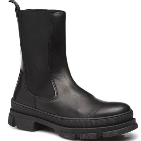 Smart Steve Madden støvle til børn i en lækker skindkvalitet. Støvlen er let, trods det kraftige udtryk på ydersålen. Bagpå støvlen er der påsat strop med logoprint. Modellen er foret med skind/tekstil. Elastik på ydersiden og lynlås på indersiden af skaftet, så den er let at få af og på.