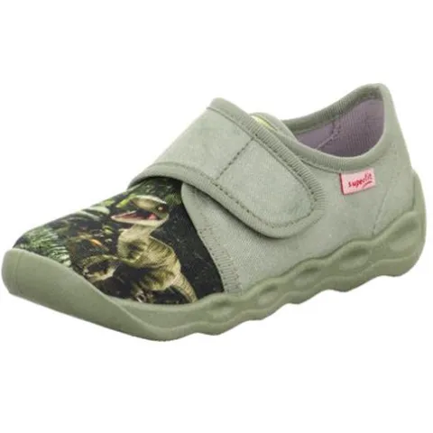 Dejlig Bubble hjemmesko med en overdel af tekstil dekoreret med et dinosaurprint på forfoden. Skoen lukkes med en bred velcrorem over vristen. Den fleksible og stødabsorberende ydersål har lufthuller underneden for øget åndbarhed.