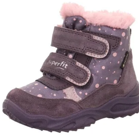 Smart Glacier vinterstøvle med lyserød glittereffekt og ruskind på slidfladerne. Støvlen lukkes med to velcroremme over vristen. Med det varme foer og den vandtætte Gore-Tex-membran holdes fødderne lune og tørre. Indersålen kan tages ud, og ydersålen er fleksibel.