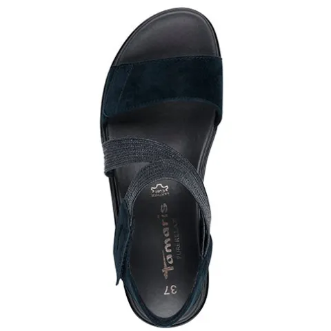 Lækker og komfortabel PureRelax sandal med en overdel af ruskind og tekstil. Sandalen lukkes med to velcroremme (forfod og vrist), og du får ekstra højde med den 4,5 cm høje hæl, som føles som blot 1,5 cm pga. den ca. 3 cm høje plateausål under forfoden. Dine fødder forkæles af Tamaris PureRelax med ekstrabløde materialer og den unikke RELAX FIT-teknologi, som lader sandalen tilpasse sig perfekt til foden med en smule mere plads om forfoden. Komforten øges yderligere af den polstrede og skindbeklædte indersål, som i øvrigt kan tages ud. Den kraftige og fleksible ydersål er stødabsorberende og giver et godt fodfæste.