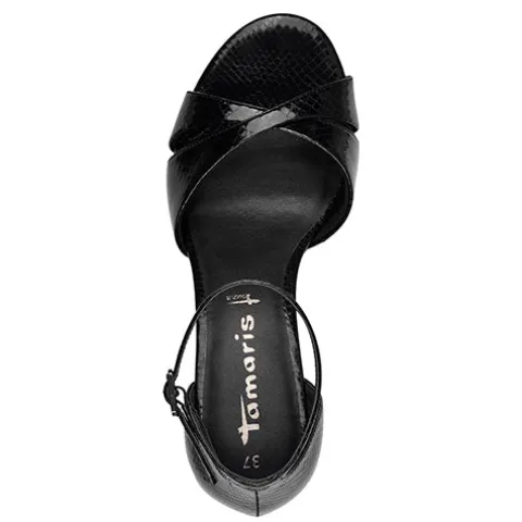Flot og superfeminin sandal med en overdel af sort syntetisk lak i slangeskindslook. En flot krydsrem over forfoden, en hælkappe samt en smal ankelrem med spænde holder skoen på plads på foden. Den polstrede Touch it-indersål øger komforten, imens den ca. 2 cm høje plateausål under forfoden får den 8,5 cm høje hæl til reelt at være 6,5 cm. Ydersålen på hælen er af tunit med ANTIslide, og ydersålen under forfoden er af gummi. 100 % vegansk.