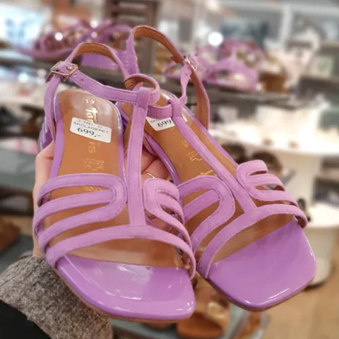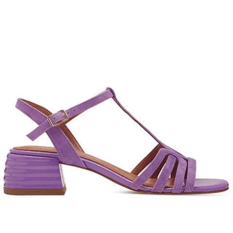 Festlig sandal med en 4,5 cm høj blokhæl med riller. Overdelen er ruskind, og sandalen lukkes med en smal ankelrem med et guldfarvet spænde. Den skindbelagte Touch It-dæksål er polstret, og ydersålen har ANTIslide.