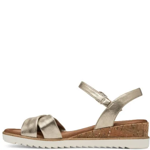 Flot sandal med en overdel af syntet i metallook med en flot krydsrem over forfoden. Sandalen lukkes over vristen med en smal velcrorem med spænde uden pind. Sandalen er ekstra feminin med den 4,5 cm høje kilehæl, som er beklædt med kork, og den ca. 1,5 cm høje plateausål under forfoden får sandalen til at føles som blot 3 cm høj, når du har den på. Komforten øges yderligere af den polstrede Touch It-indersål. Den kraftige ydersål er stødabsorberende og giver med sine riller et godt fodfæste. Sandalen er 100 % vegansk.