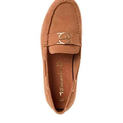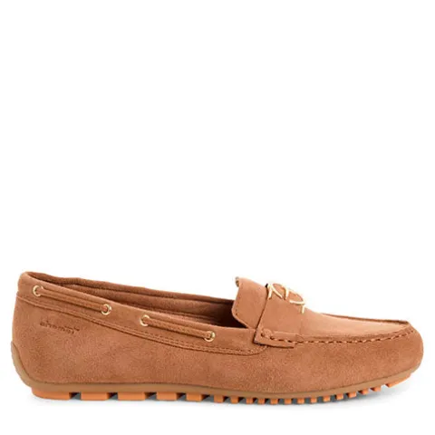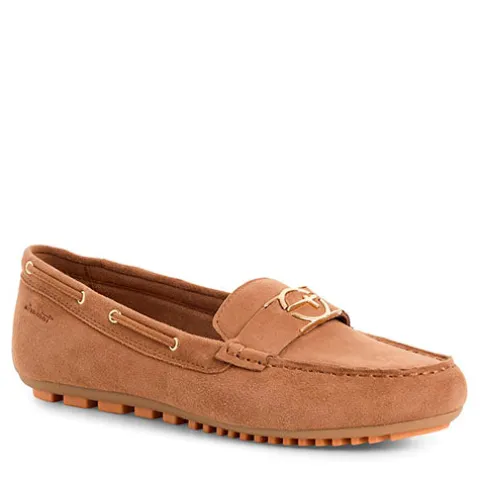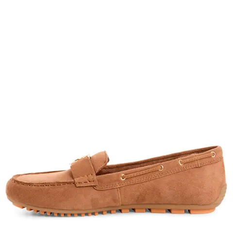 Lækker loafer med en overdel af ruskind med en rem med et guldfarvet metallogo, og kanten er dekoreret med et pyntebånd gennem guldfarvede øjer. Den udtagelige indersål er blød, polstret og komfortabel og beklædt med skind, og sammen med det bløde tekstilfoer får foden et godt klima. Den karakteristiske gummiydersål er meget fleksibel samt stødabsorberende med et godt vejgreb, og den er forlænget et stykke op ad hælen for ekstra slidstyrke. Skoen er meget let. Er en smule stor i størrelsen, så ligger du mellem to størrelser, anbefaler vi, at du vælger den mindste størrelse. Her får du et par loafers perfekt til både hverdag og fest.