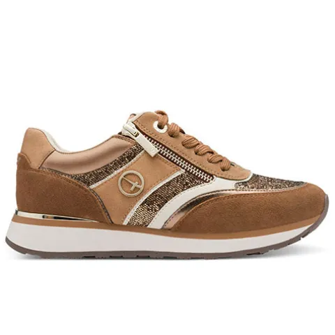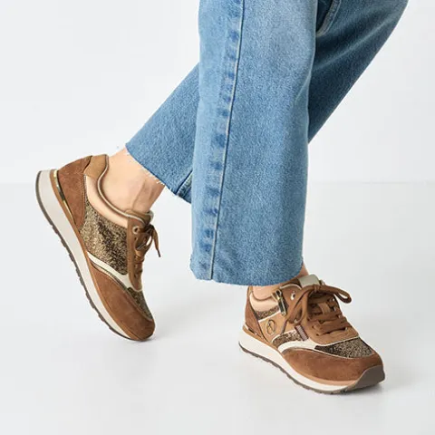 Smart damesneaker med en overdel af ruskind, glat skind, syntet og tekstil med glimmereffekt og syntet med flotte detaljer. Skoen justeres med snørebånd og lukkes med en lynlås på ydersiden af snørebåndet. Åbningen er polstret for øget komfort. Den udtagelige indersål er polstret og komfortabel, og gummiydersålen er stødabsorberende med et godt fodfæste.
