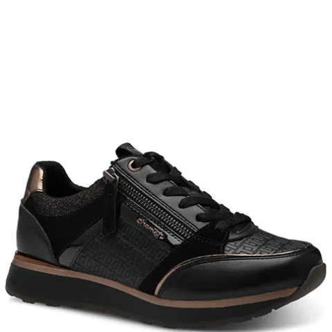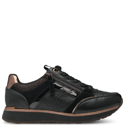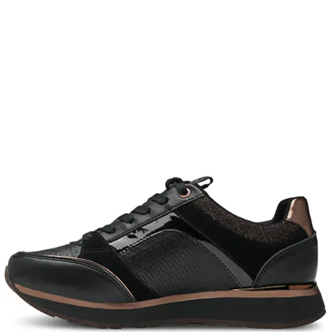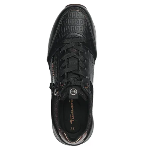 Flot og feminin sneaker fra Tamaris med masser af flotte detaljer, bl.a. kobbernistret tekstil på pløs og om åbning, en kobberfarvet lynlås, trækfane på pløs med Tamaris-logo, kobberfarvet kant om hælen og på forfoden, kobberfarvet logo på siden og præget ‘T’-mønster på siderne og ovenpå forfoden. Skoen justeres med snørebånd og åbnes/lukkes med lynlås på siden. Åbningen og den udtagelige indersål er polstret for ekstra komfort. Ydersålen giver et godt fodfæste.