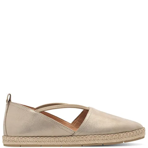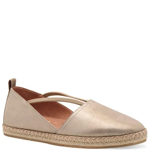 Sød espadrillesko med en overdel af nubuck med guldeffekt. En trækfane på hælen gør det nemt at få skoen på, og to elastikker sørger for at holde foden på plads, imens en elastikkile på indersiden giver individuel tilpasning i løbet af dagen. Touch-It-indersålen er blød og komfortabel og beklædt med skind, og ydersålen er stødabsorberende med et godt fodfæste.