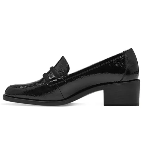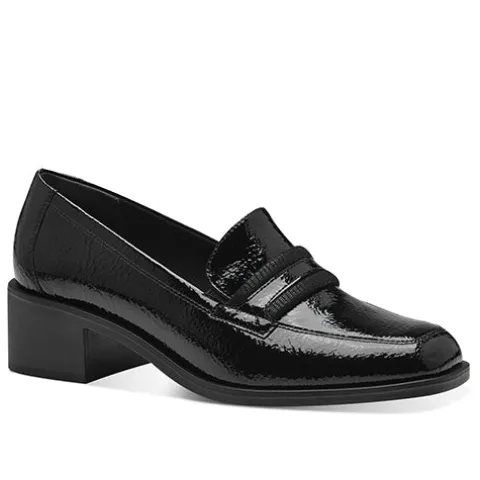Flot sko i loaferstil med 5 cm høj blokhæl og tre remme over forfoden. Overdelen er af lakeret syntet, og elastikkiler ved åbningen giver skoen mulighed for at tilpasse sig foden i løbet af dagen. Indvendigt er skoen polstret i hælen for øget komfort, og den polstrede Touch it-indersål er beklædt med skind. Ydersålen har Anti Slide.