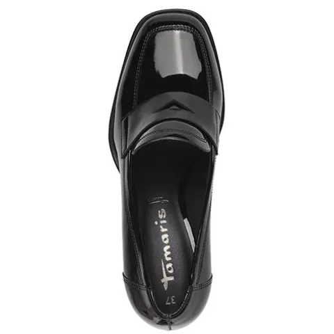 Flot sko i pennyloaferstil med en 7,5 cm høj blokhæl. Overdelen er af lakeret syntet, og Touch-it-indersålen er polstret og komfortabel. Ydersålen har ANTISlide, og skoen er 100 % vegansk.