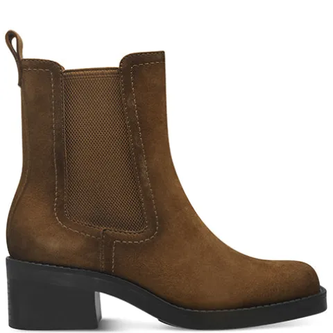 Lækker Chelsea-støvle med en overdel af ruskind og elastikpanel på begge sider. En trækfane bagpå gør det nemt at træde i støvlen, som har en polstret og blød indersål. Den prominente ydersål med en 5,5 cm høj blokhæl og 1,5 cm høj forfodsplateau gør støvlen feminin og afslappet på samme tid.