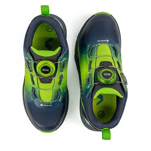 Flot SKY Mid BOA GTX sneakerstøvle med en overdel af meshtekstil og slidstærk TPU-belægning på snuden og ved BOA-snøren. Skoen har mange flotte detaljer, og den lukkes med det brugervenlige BOA® Fit System, som sikrer en perfekt tilpasning til foden, imens en trækfane bagpå gør det nemmere at træde i skoen. En åndbar og vandtæt Gore-Tex®-membran sørger for tørre fødder, og indvendig har skoen et blødt GTX Soft Fleece-foer. Med VADO Two-Width System har skoen to indersåler, som giver henholdsvis Medium og Wide Fit; fjern den nederste for mere rummelighed eller plads til ortopædiske indlæg. Indersålen er desuden markeret med vokseplads. EVA-mellemsålen er støddæmpende, og gummiydersålen sikrer et godt fodfæste. VADO X Flex-zonen i det forreste område af sålen har vist sig at understøtte en sund gangudvikling. Denne sko fra VADO mestrer udfordringerne i naturen lige så godt som dem i skolegården.