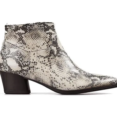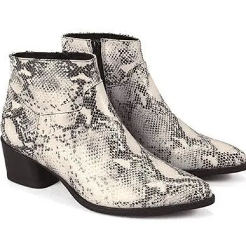 Flot Lara støvle i slangeskindslook. Støvlen er med tilspidset snude og lynlås på indvendig side af skaftet. Indvendig er der tekstilfoer og dæksål i skind. Kraftig, firkantet hæl.