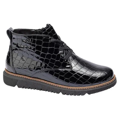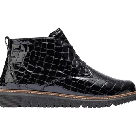Kort Gesa ankelstøvle med en overdel af krokodillepræget lakskind med en brun kontrastdetalje med syning hele vejen rundt mellem overdel og sål. Støvlen justeres med snørebånd og lukkes med en lynlås på indersiden. Med vidde K er der god plads til den bredere fod. Den polstrede indersål kan tages ud, og den fleksible og grove ydersål er stødabsorberende med et godt fodfæste. Fås i halve størrelser.