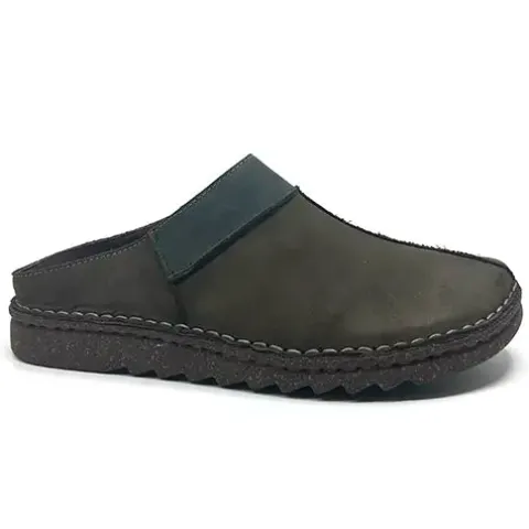 Dejlig hjemmesko med en overdel af nubuck med kraftige syninger. Indvendig har hjemmeskoen et skindfoer, og dæksålen er beklædt med ruskind. Den fleksible ydersål med tydelige riller er stødabsorberende med et godt fodfæste.