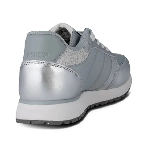 Flot og opsigtsvækkende Ronja Metallic sko med en overdel af LWG-certificeret, sølvfarvet glat skind, ASC-certificeret og genanvendt fiskeskind, tekstil og genanvendt mesh-tekstil. Skoen lukkes med snørebånd, og åbningen er polstret for øget komfort og støtte. Den udtagelige, støbte PU-indersål med korkbeklædning og WODEN Air Flow System™ giver optimal komfort, støtte og åndbarhed. Letvægtsmellemsålen af EVA er stødabsorberende, og den slidstærke gummiydersål med 10 % genanvendt gummi giver med sit mønster et godt fodfæste.