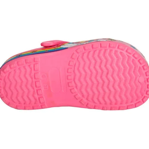 Sød Burundi Closed Kids sandal med blink i sålen. Overdelen er af PU med lufthuller for åndbarhed om forfoden. En drejelig hælstrop sørger for at holde foden på plads i sandalen, men kan også drejes op på vristen for en slippers-model. Dæksålen er stødabsorberende, og ydersålen, som er dekoreret med bl.a. regnbuer, hjerter og stjerner, der lyser op ved gang, er stødabsorberende med et fint fodfæste.