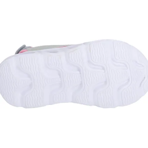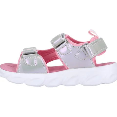 Kaptasia Kids sandalen med lys er en fin pigesandal, der reguleres og lukkes med tre velcroremme (forfod, vrist og hæl). Overdelen changerer smart i sølv og lyserød og har en del sølvglimmer, og ved hvert skridt blinker 5 lys langs ydersiden af mellemsålen.