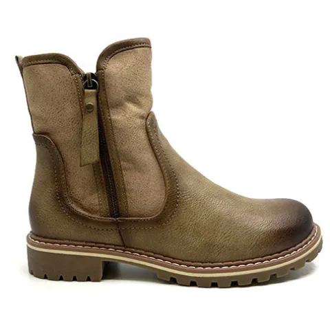 Dejlig 5th Avenue vinterstøvle med en overdel af imiteret glat skind og tekstil med en pyntelynlås på ydersiden af anklen. Støvlen lukkes med en lynlås på indersiden af anklen, og en trækfane bagpå gør det nemt at træde i støvlen. Indvendig har skaftet et blødt plysfoer, imens resten af støvlen har et blødt, lunt fleecefoer, og indersålen er blød og behagelig. Den kraftige og godt mønstrede gummiydersål er stødabsorberende med et godt vejgreb.