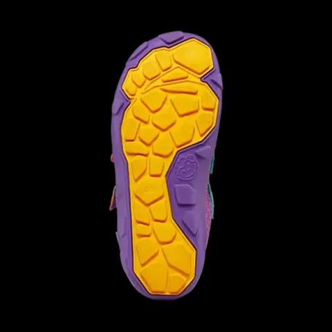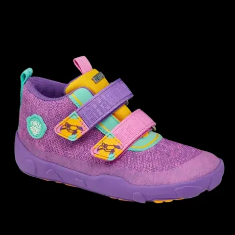 Dejlig Low Boot Knit Happy Creative Tucan sko med en overdel af strikket tekstil af bluesign®-certificeret polyester, foret med genanvendt polyester. Lukkes med to velcroremme over vristen, og trækfane på hæl og pløs gør det nemt at træde i skoen, som har en høj ankel. Åbningen og pløsen er polstrede for øget komfort og støtte, og skoen er udstyret med en åndbar og vandtæt AffenTex-membran, så fødderne holdes behageligt tørre. Indersålen er lavet af syntetisk skum og plantebaseret BLOOM™ skum, som er verdens første algebaserede EVA-skum til sko. Skoen er en Barefoot-model med en så tynd som muligt ydersål, så barnet kan mærke og opfatte underlaget. Ydersålen består af 70 % syntetisk gummi og 30 % naturligt gummi og er stødabsorberende med et godt vejgreb. Skoen er 100 % vegansk.