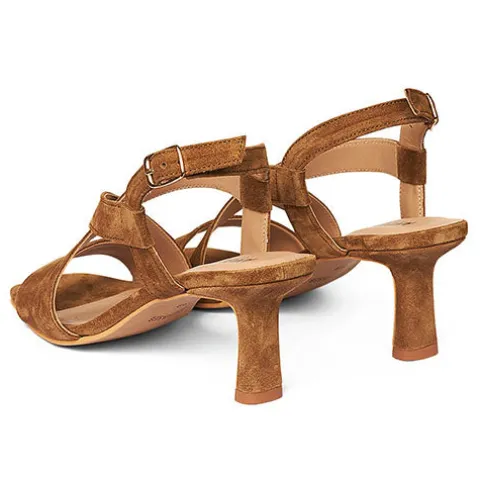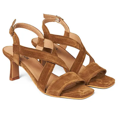 Flot og feminin Angulus sandal med hæl. Sandalen har en rem over forfoden samt krydsrem over vristen, og den lukkes med en rem med guldspænde om hælen. Indersålen af skind er ekstra polstret på hælen og gør sandalen behagelig at have på. Kan styles op og ned efter behov. Produceret i Portugal.