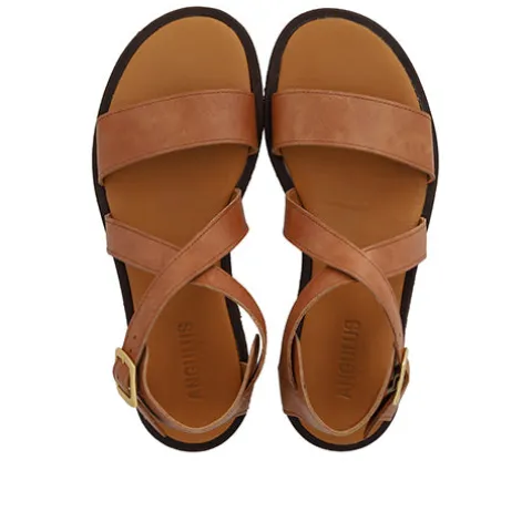 Lækker sandal med en overdel af glat skind med en rem over forfoden og et flot krydsremsdesign over vristen. Sandalen lukkes med et spænde på ankelremmen. Dæksålen er beklædt med kromfrit skind, imens den mørkebrune og FSC-certificerede rågummiydersål er fleksibel og stødabsorberende med et fint fodfæste, og naturgummiet er genanvendeligt. Fås i halve størrelser. Udformet i naturligt og åndbart skind. Designet i Danmark og håndlavet med kærlighed i Portugal.
