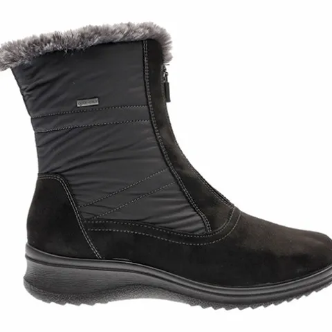 Dejlig München vinterstøvle med GORE-TEX. Overdelen er af tekstil og syntet med en kant af imiteret pels i åbningen. Støvlen lukkes med en central lynlås ned over vristen. Indvendig har støvlen et varmt foer, og med en åndbar og vandtæt GORE-TEX-membran holdes fødderne varme og tørre. Med vidde H er der plads til den bredere fod. Med en smule hælhøjde i kilehælen får du et feminint look med den fleksible Tecno Rubber-ydersål, som er stødabsorberende med et godt fodfæste.