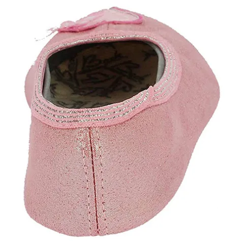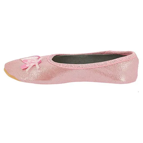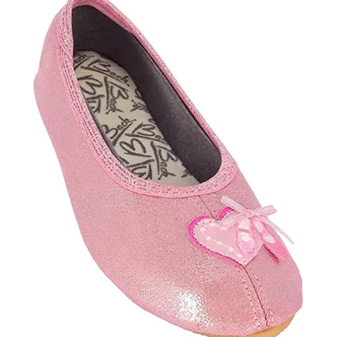Ballett gymnastiksko med elastik i indsteppet. Den lyserøde glimmersko er pyntet med hjerte og balletsko på forfod. Blød og meget fleksibel ydersål af gummi.