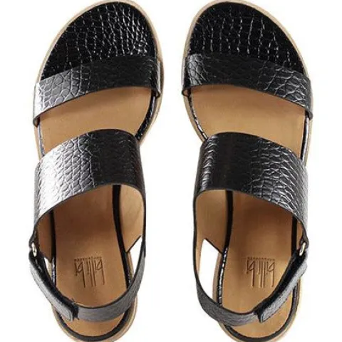 Sort sandal fra Billi Bi i slangeskindspræget læder med rundet snude og en flad hæl. Skoen har en smal rem henover forfodenen, en bred rem over vristen samt en rem bagom hælen med velcrolukning.