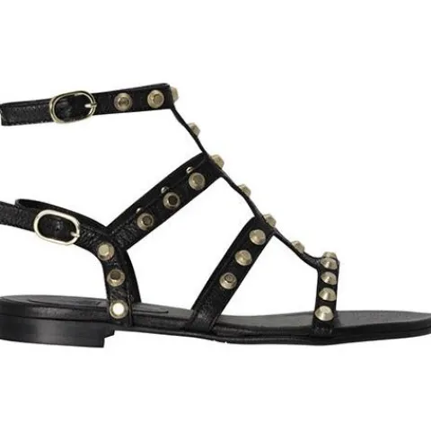 Flot Billi Bi sandal i skind med tynde remme dekoreret med guldnitter omkring anklen og på tværs af forfoden. Begge ankelremme lukkes med et guldspænde. Skindfoer og dæksål i skind.
