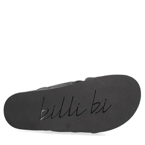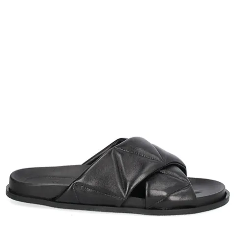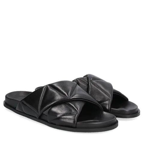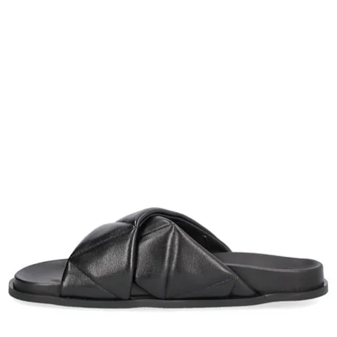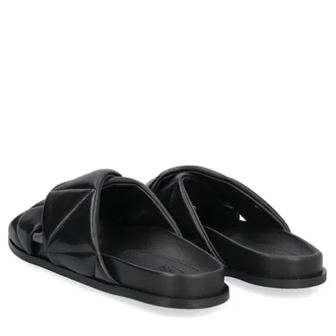 Håndlavet sort slip-in sandal udført i glat skind med en afrundet snude. Sandalen har to stropper, der krydser forfoden med quiltede detaljer på.