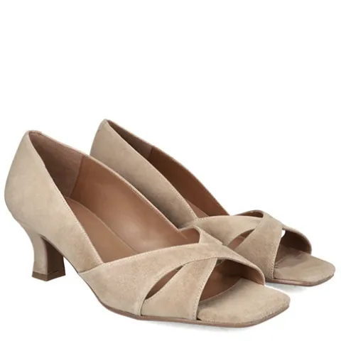 Håndlavet damesko udført i beige ruskind med firkantet snude. Forfoden har et elegant og dekorativt snit, og skoen har også en kort og sofistikeret hæl.
