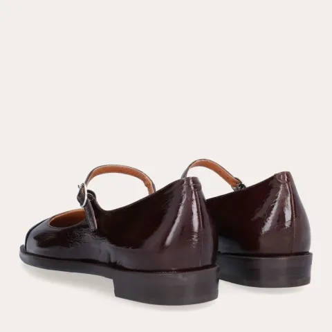 Superlækker Mary Jane sko fra Billi Bi. Denne håndlavede sko er udført i mørkebrunt lakeret skind med firkantet snude med sort lakskind. Skoen lukkes med en smal rem med et lille guldfarvet spænde. Skoen har et skindfoer og en polstret indersål, og ydersålen giver et fint fodfæste.