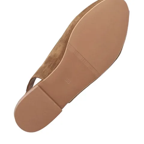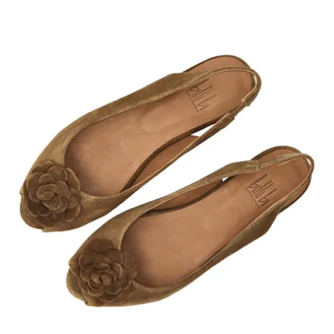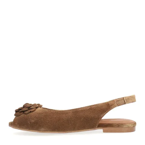 Sød og feminin peep-toe slingback med en overdel af blødt ruskind, dekoreret med en ruskindsblomst på forfoden. Slingback-remmen er udstyret med elastik, så den tilpasser sig din fod. Indvendig har skoen et skindfoer, og den polstrede dæksål er beklædt med skind, så du er sikret et optimalt fodklima. Ydersålen er fleksibel med et fint fodfæste. Håndlavet i Spanien.
