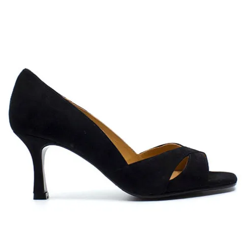 Håndlavet sort Billi Bi pump, udført i ruskind med peep toe, firkantet snude og mellem høj hæl. Skoen har to elegante remme, der krydser forfoden.