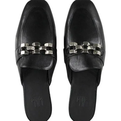 Sort slip-on fra Billi Bi i blødt skind med kædedetalje over forfod. Skindfoer og dæksål i skind.