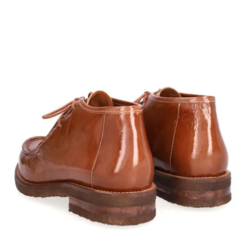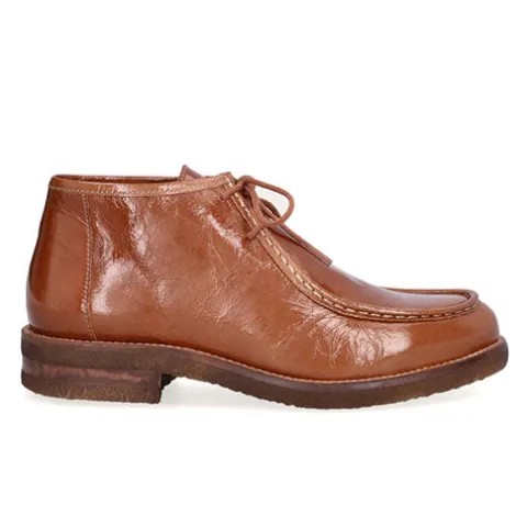 Håndlavet Venice desert boot med en overdel af lakeret skind med rund tå og moc toe-syning. Støvlen lukkes med snørebånd. Indvendig er støvlen foret med skind, og indersålen er blød. Den fleksible rågummiydersål er stødabsorberende med et godt fodfæste.