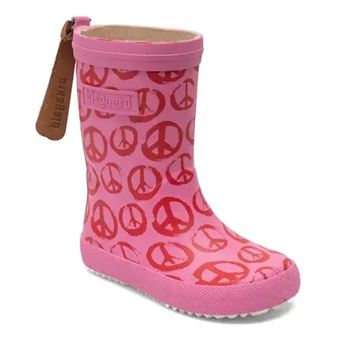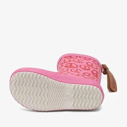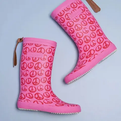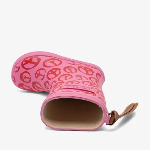 Dejlig Peace On Earth Pinky gummistøvle med en overdel af 100 % vandtæt naturligt gummi, og med en lang trækfane af blødt skind er gummistøvlen nem at hoppe i. Indvendig har gummistøvlen et blødt bomuldsfoer, som sikrer komfort og et sundt miljø for foden, og den bomuldsbeklædte indersål kan tages ud. Gummistøvlen er designet med smalt skaft og tæt pasform omkring foden for optimal støtte og stabilitet. Den fleksible og lette ydersål er stødabsorberende med et godt fodfæste. Sæt farve på regnfulde dage med disse stilfulde, vandtætte og slidstærke gummistøvler med legende print, der gør regnvejrsdagene lidt sjovere.