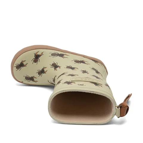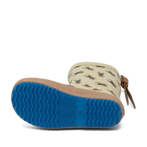 Dejlig Brown Beetles gummistøvle med en overdel af 100 % vandtæt naturligt gummi, og med en lang trækfane af blødt skind er gummistøvlen nem at hoppe i. Indvendig har gummistøvlen et blødt bomuldsfoer, som sikrer komfort og et sundt miljø for foden, og den bomuldsbeklædte indersål kan tages ud. Gummistøvlen er designet med smalt skaft og tæt pasform omkring foden for optimal støtte og stabilitet. Den fleksible og lette ydersål er stødabsorberende med et godt fodfæste. Sæt farve på regnfulde dage med disse stilfulde, vandtætte og slidstærke gummistøvler med legende print, der gør regnvejrsdagene lidt sjovere.