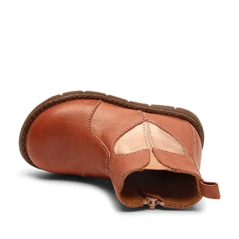 Feminin ankelstøvle med smukt hjerteformet design, der appellerer til alle sæsoner. Støvlen er håndlavet i Portugal af 100% bionedbrydeligt vegetabilsk garvet læder. Støvlen er designet med lynlås i siden, som gør det let at tage støvlerne af og på.