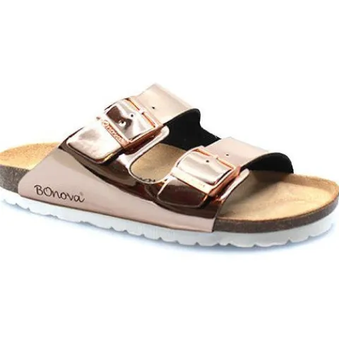 Sandal fra Bonova med forstøbt biosål. Overdelen er lavet i guldfarve med spejleffekt. Mulighed for regulering over vristen med spændelukning. Bløde og fleksible gummisåler.
