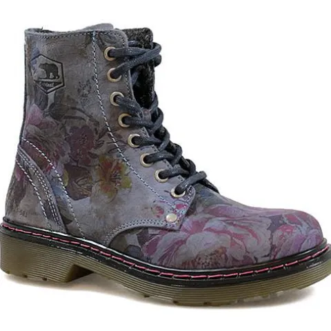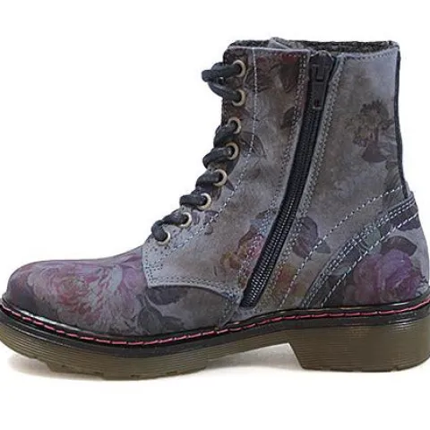 Snørestøvle fra Bullboxer med blomster påtrykt hele støvlen. Blå snørebånd og pink syninger rundt i sålkanten. Indvendig på skaftet et der lynlås. Støvlen er foret med et lunt tekstilfor.