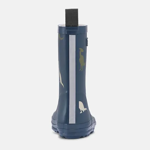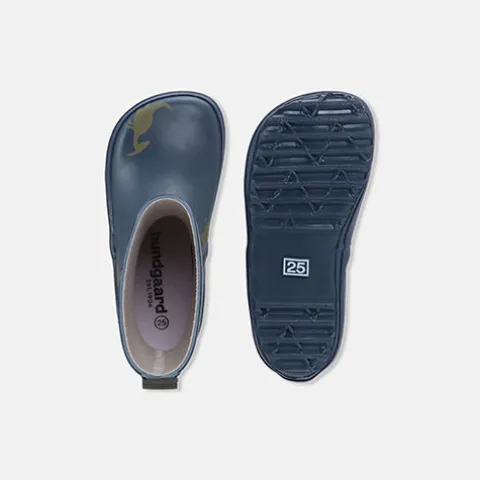 Dejlig Charly Barfod Navy Dino gummistøvle, perfekt til at holde små fødder tørre på regnfulde dage med sjov i vandpytter og designet til at være slidstærk og holdbar. Gummistøvlen er lavet i naturgummi og er let, blød og fleksibel, og refleksdetaljen på bagkappen sørger for ekstra synlighed i mørkt vejr. Trækfanen bagpå gør det nemt at træde i gummistøvlen. Gummistøvlen har en naturlig pasform, der giver de små tæer masser af bevægelsesfrihed, og den er bred fortil og smal bagtil, hvilket giver optimalt hold på foden – både til normale og lidt bredere fødder. Indvendig har gummistøvlen et bomuldsfoer, og den udtagelige indersål er beklædt med bomuld. Den fleksible ydersål giver et godt fodfæste på våde overflader. Charly gummistøvlen er helt fri for PVC, PFAS og andre skadelige kemikalier.