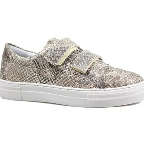 Smart sko med en fed overdel af metallisk, præget skind. Skoen lukkes med to velcroremme over vristen, og åbningen er polstret for øget komfort. Indvendig har skoen et skindfoer, og indersålen er beklædt med skind. Gummiydersålen er stødabsorberende med et fint fodfæste.