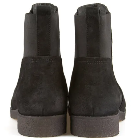 Rå ankelstøvle med en overdel af ruskind samt elastik i siden og bag på skaftet. Den fleksible rågummiydersål er blød og stødabsorberende med et fint fodfæste.
